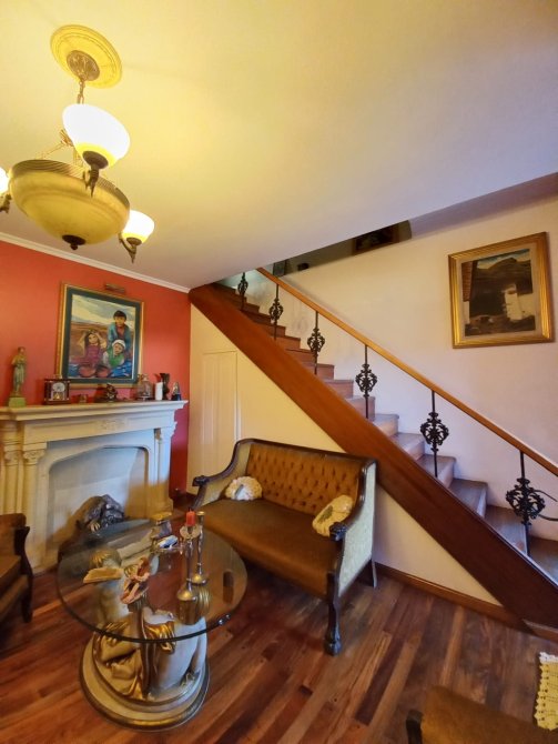 Amplio living con pisos entarugados, hogar, ventana de dos hojas al frente, con rejas.