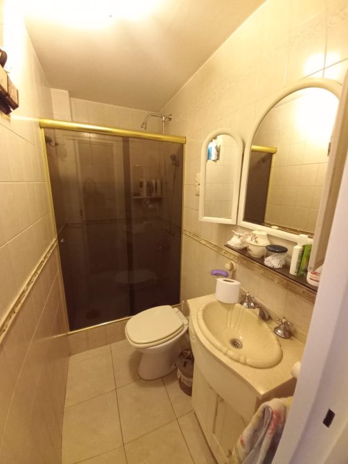 Baño con revestimiento cerámico, vanitory, sanitarios y receptáculo de ducha con mampara de vidrio templado.