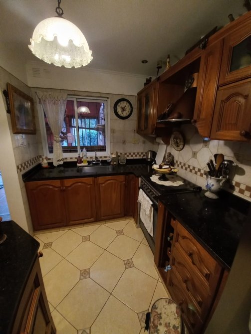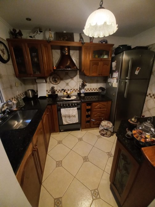 Cocina con amueblamientos, bajo mesada y alacena en madera con vidrios arenados y pintados, pisos cerámicos.