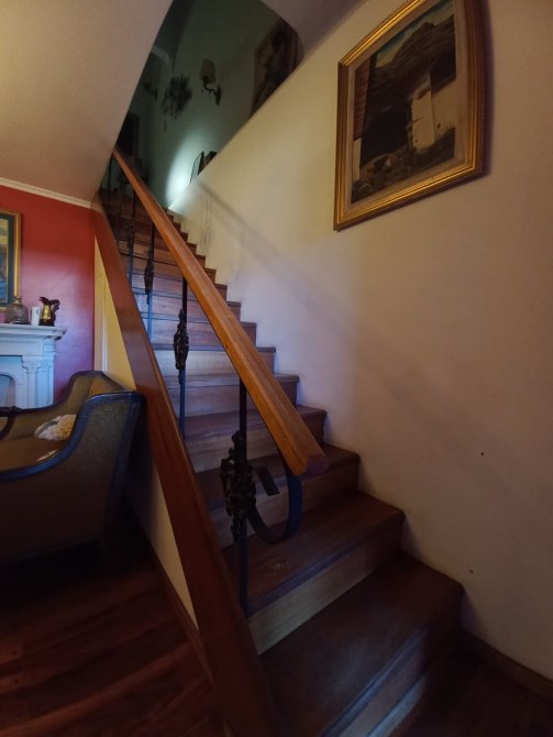 Escalera en cedro con barandas en hierro forjado con pasamanos en madera.