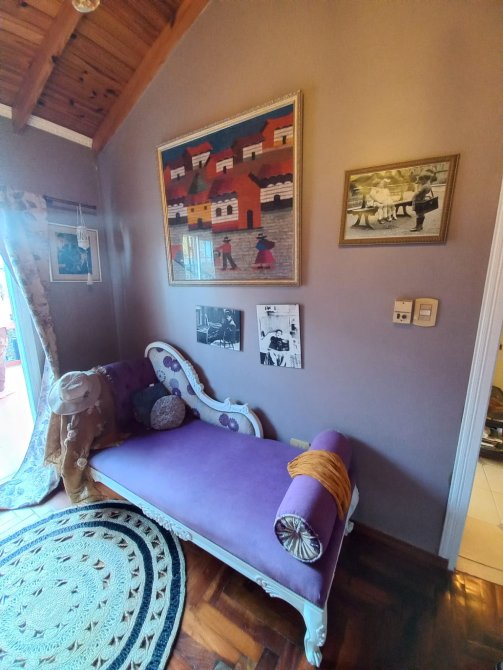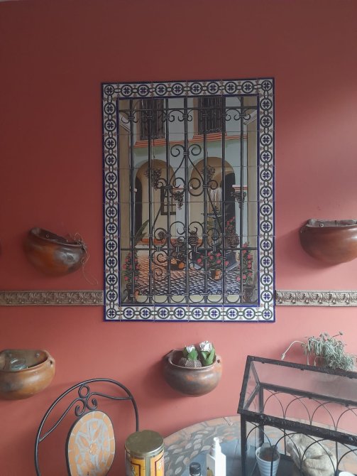 Galería cubierta con pisos rùsticos y cerramientos de aluminio con vidrios repartidos biselados, comunica al parque.